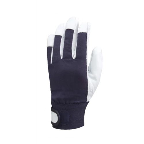 | Cikkszám: 1DRI860010 Termékleírás: erezett színkecskebőr sofőrkesztyű, hüvelykujj és körömvédő, kék pamutvászon kézhát, elasztikus mandzsetta, állítható fekete tépőzáras szegéllyel, kényelem, fogásbiztosság. Tenyere 0,7-0,8 mm vastag, fehér, szín kecskebőr, 300 g/m² vastag sötétkék pamut hátrész, 50 mm széles sötétkék rugalmas mandzsetta. Méret: 10