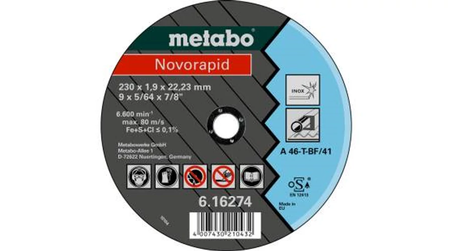 | Szavatossági ideje van a terméknek! Cikkszám: 616274000 Vékony darabolótárcsák rozsdamentes, vékony falú anyagok - csövek, lemezek, profilok, drótok, stb. - megmunkálásához, valamint általános fémmegmunkáláshoz. Jó vágásteljesítmény hosszú élettartammal. Keménység: kemény. Csekélyebb anyagfelhasználás, erőtakarékos, csekélyebb mértékű gépterhelés. Vas-, kén- és klórmentes (Fe + S + Cl ≤ 0,1 %). Maximális munkasebesség: 80 m/s. Minőségi osztály: A 46-T. Átmérő x vastagság x furat: 230 x 1.9 x 22.23 mm. Kivitel: egyenes. Max. fordulatszám: 6600 /min. Kiszerelés: 25 db/doboz