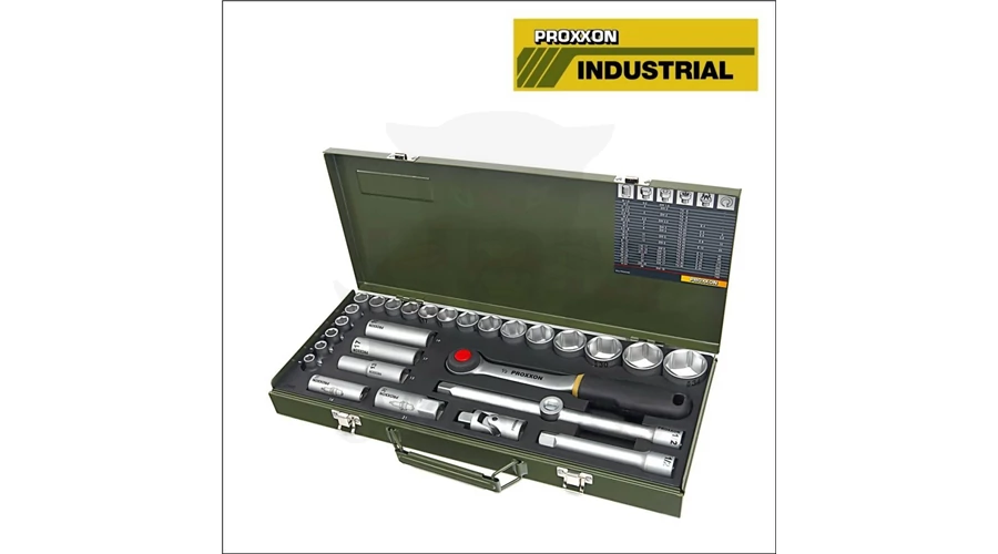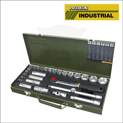 | PROXXON Dugókulcs készlet 1/2" 6 lap 8-34 mm 29 részes PROXXON (23.000) . Proxxon Werkzeug GmbH 29 részes 1/2"-os komplett dugókulcs készlet Méretek: - 19 db 1/2"-os normál hatlapú dugókulcsfejek: 8 - 34 mm (8-9-10-11-12-13-14-15-16-17-18-19-21-22 -24-27-30-32-34 mm) - 3 db 1/2"-os hosszított hatlapú dugókulcsfejek: 13 - 17 - 19 mm - 2 db 1/2"-os gyertyakulcs fejek: 16 és 21 mm - 1 db 1/2"-os nyomógombos standard racsnis hajtószár - 1 db 1/2"-os csukló - 2 db 1/2"-os toldószár - 1 db 1/2"-os Fix toldó-hajtószár (1/2"-os hosszútoldón lévő csúszkás - fix szár adapter) . Tömeg: 5.680kg. Szín: Chrom. Anyag: Chrome Vanadium acél. Méret: 1/2".