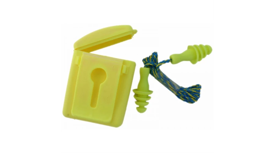 többször használatos, mosható, zsinóros sárga füldugó, rugalmas elasztomer anyagból