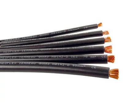Sodrott, réz kábel, gumi szigetelt. Különösen hajlékony rézvezető, fóliából készült elválasztó szalag, olaj-, lángálló- és kopásálló, fekete polikloropén külső köpeny. |