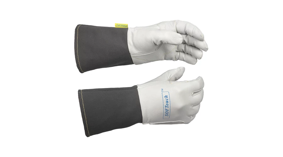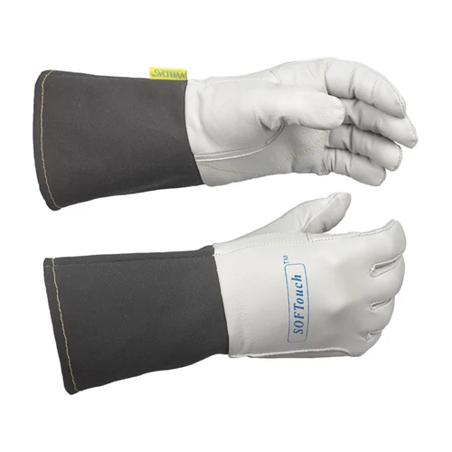 SOFTouch™ hegesztő kesztyű szemcsés kecskebőrből, a mandzsetta szürke lángálló szövetből készült.