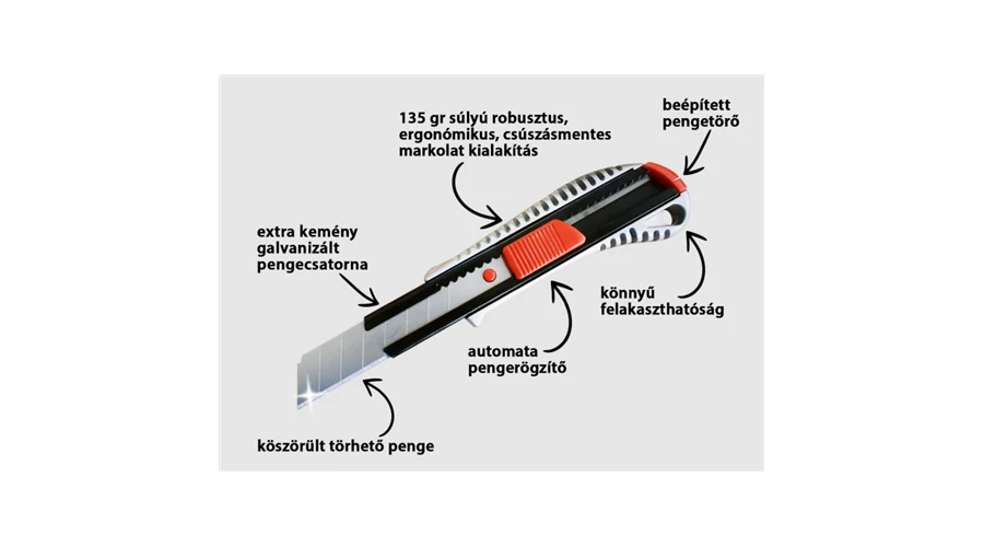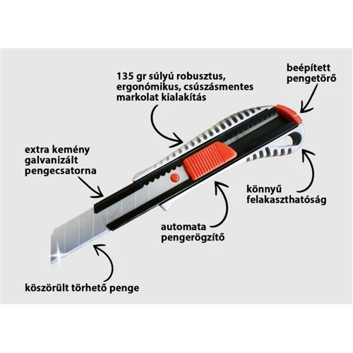 Kés automata pengerögzítővel, beépített pengetörővel. Felakasztható kivitel, extra kemény, galvanizált pengecsatorna.