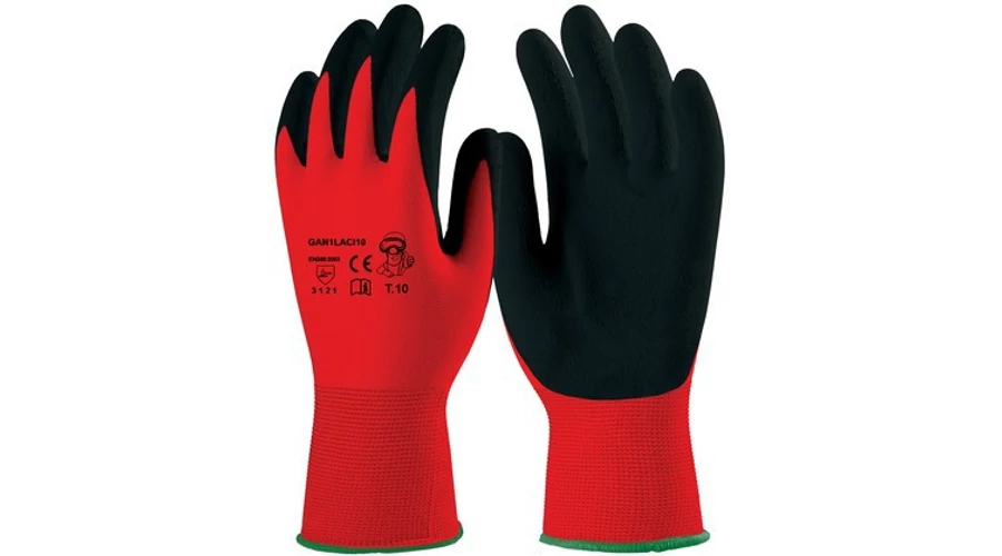 | Cikkszám: GAN1LACI11 Méret. 11 Termékleírás 13-as kötésű, piros, kopásálló poliészter alapkesztyű. Tenyerén érdesített, csúszásbiztos fekete latex mártás. Gumírozott mandzsetta, szellőző kézhát. Kiválóan alkalmas intenzív fizikai munkákhoz akár nedves körülmények közt is. EN388:2016 3121x Minősítések: EN420, EN388: 3121